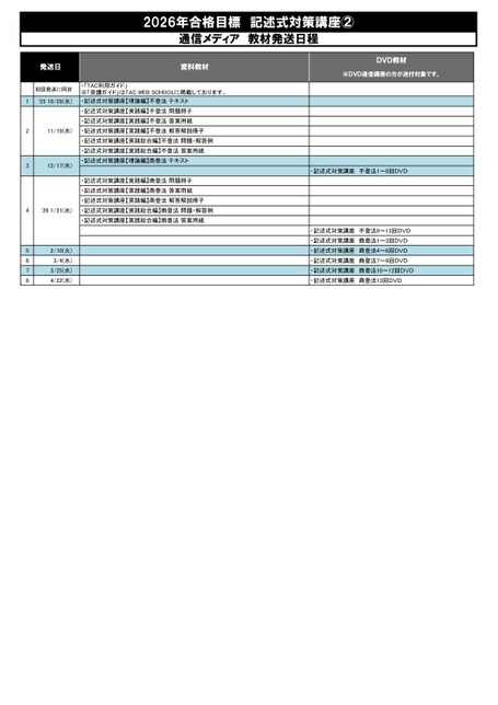 2026年合格目標記述式対策講座②通信メディア教材発送日程発送日資料教材初回発送に同封・「TAC利用ガイド」※「受講ガイド」はTACWEBSCHOOLに掲載しております。1'2510/29(水)・記述式対策講座【理論編】不登法テキスト・記述式対策講座【実践編】不登法問題冊子・記述式対策講座【実践編】不登法答案用紙11/19(水)・記述式対策講座【実践編】不登法解答解説冊子・記述式対策講座【実践総合編】不登法問題・解答例・記述式対策講座【実践総合編】不登法答案用紙・記述式対策講座【理論編】商登法テキスト12/17(水)23・記述式対策講座【実践編】商登法問題冊子・記述式対策講座【実践編】商登法答案用紙・記述式対策講座【実践編】商登法解答解説冊子4'261/21(水)・記述式対策講座【実践総合編】商登法問題・解答例・記述式対策講座【実践総合編】商登法答案用紙56782/10(火)3/4(水)3/25(水)4/22(水)DVD教材※DVD通信講座の方が送付対象です。・記述式対策講座不登法1~8回DVD・記述式対策講座不登法9~13回DVD・記述式対策講座商登法1~3回DVD・記述式対策講座商登法4~6回DVD・記述式対策講座商登法7~9回DVD・記述式対策講座商登法10~12回DVD・記述式対策講座商登法13回DVD