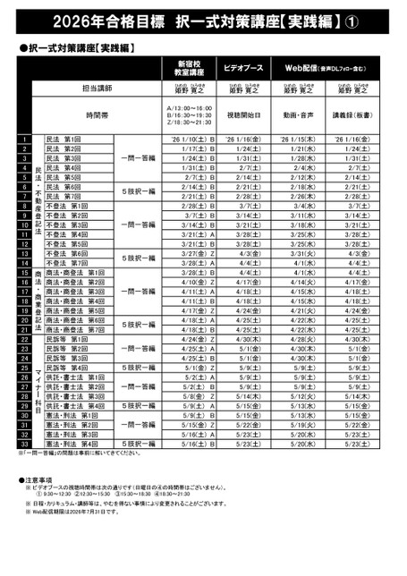 2026年合格目標択一式対策講座【実践編】①●択一式対策講座【実践編】担当講師時間帯新宿校教室講座ビデオブースWeb配信(音声DLフォロー含む)ひめの姫野ひろゆき寛之ひめの姫野ひろゆき寛之ひめの姫野ひろゆき寛之ひめの姫野ひろゆき寛之A/13:00~16:00B/16:30~19:30Z/18:30~21:30視聴開始日動画・音声講義録(板書)'261/16(金)'261/15(木)'261/16(金)1/24(土)1/31(土)2/7(土)2/14(土)2/21(土)2/28(土)3/7(土)3/14(土)3/21(土)3/28(土)3/28(土)4/3(金)4/4(土)4/4(土)4/17(金)4/18(土)4/18(土)4/24(金)4/25(土)4/25(土)4/30(木)5/1(金)5/1(金)5/9(土)5/9(土)5/9(土)5/14(木)5/15(金)5/15(金)5/22(金)5/23(土)5/23(土)1/21(水)1/28(水)2/4(水)2/12(木)2/18(水)2/26(木)3/4(水)3/11(水)3/18(水)3/25(水)3/25(水)3/31(火)4/1(水)4/1(水)4/14(火)4/15(水)4/15(水)4/21(火)4/22(水)4/22(水)4/28(火)4/30(木)4/30(木)5/9(土)5/9(土)5/9(土)5/12(火)5/13(水)5/13(水)5/19(火)5/20(水)5/20(水)1/24(土)1/31(土)2/7(土)2/14(土)2/21(土)2/28(土)3/7(土)3/14(土)3/21(土)3/28(土)3/28(土)4/3(金)4/4(土)4/4(土)4/17(金)4/18(土)4/18(土)4/24(金)4/25(土)4/25(土)4/30(木)5/1(金)5/1(金)5/9(土)5/9(土)5/9(土)5/14(木)5/15(金)5/15(金)5/22(金)5/23(土)5/23(土)'261/10(土)1/17(土)1/24(土)1/31(土)2/7(土)2/14(土)2/21(土)2/28(土)3/7(土)3/14(土)3/21(土)3/21(土)3/27(金)3/28(土)3/28(土)4/10(金)4/11(土)4/11(土)4/17(金)4/18(土)4/18(土)4/24(金)4/25(土)4/25(土)5/1(金)5/2(土)5/2(土)5/8(金)5/9(土)5/9(土)5/15(金)5/16(土)5/16(土)BBBBBBBBBBABZABZABZABZABZABZABZAB民法第1回民法第2回民法第3回民法第4回民法第5回民法第6回民法第7回不登法第1回不登法第2回不登法第3回不登法第4回不登法第5回不登法第6回不登法第7回一問一答編5肢択一編一問一答編5肢択一編商法・商登法第1回商法・商登法第2回商法・商登法第3回一問一答編商法・商登法第4回商法・商登法第5回商法・商登法第6回商法・商登法第7回民訴等第1回民訴等第2回民訴等第3回民訴等第4回5肢択一編一問一答編5肢択一編供託・書士法第1回供託・書士法第2回一問一答編供託・書士法第3回供託・書士法第4回5肢択一編憲法・刑法第1回憲法・刑法第2回憲法・刑法第3回憲法・刑法第4回一問一答編5肢択一編民法・不動産登記法商法・商業登記法マイナー科目123456789101112131415161718192021222324252627282930313233※「一問一答編」の問題は事前に解いてきてください。●注意事項※ビデオブースの視聴時間帯は次の通りです(日曜日の④の時間帯はございません)。①9:30~12:30②12:30~15:30③15:30~18:30④18:30~21:30※日程・カリキュラム・講師等は、やむを得ない事情により変更されることがございます。※Web配信期限は2026年7月31日です。