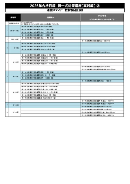 2026年合格目標択一式対策講座【実践編】②通信メディア教材発送日程発送日資料教材初回発送に同封・「TAC利用ガイド」※「受講ガイド」はTACWEBSCHOOLに掲載しております。1'2512/17(水)2'262/10(火)33/4(水)・択一式対策講座【実践編】民法1(一問一答編)・択一式対策講座【実践編】民法2・3(一問一答編)・択一式対策講座【実践編】民法4・5(一問一答編)・択一式対策講座【実践編】民法6・7(5肢択一編)・択一式対策講座【実践編】不登法1(一問一答編)・択一式対策講座【実践編】不登法2・3(一問一答編)・択一式対策講座【実践編】不登法4・5(一問一答編)・択一式対策講座【実践編】不登法6・7(5肢択一編)・択一式対策講座【実践編】商・商登法1(一問一答編)・択一式対策講座【実践編】商・商登法2・3(一問一答編)・択一式対策講座【実践編】商・商登法4・5(一問一答編)・択一式対策講座【実践編】商・商登法6・7(5肢択一編)43/25(水)54/22(水)・択一式対策講座【実践編】民訴等1(一問一答編)・択一式対策講座【実践編】民訴等2・3(一問一答編)・択一式対策講座【実践編】民訴等4(5肢択一編)・択一式対策講座【実践編】供託・書士法1・2(一問一答編)・択一式対策講座【実践編】供託・書士法3(一問一答編)・択一式対策講座【実践編】供託・書士法4(5肢択一編)64/28(火)・択一式対策講座【実践編】憲法・刑法1・2(一問一答編)・択一式対策講座【実践編】憲法・刑法3(一問一答編)・択一式対策講座【実践編】憲法・刑法4(5肢択一編)785/13(水)5/29(金)DVD教材※DVD通信講座の方が送付対象です。・択一式対策講座【実践編】民法1~3回DVD・択一式対策講座【実践編】民法4~5回DVD・択一式対策講座【実践編】民法6~7回DVD・択一式対策講座【実践編】不動産登記法1~2回DVD・択一式対策講座【実践編】不登法3~7回DVD・択一式対策講座【実践編】商・商登法2~4回DVD・択一式対策講座【実践編】商・商登法5~7回DVD・択一式対策講座【実践編】民訴等1~2回DVD・択一式対策講座【実践編】民訴等3~4回DVD・択一式対策講座【実践編】供託・書士法1~4回DVD・択一式対策講座【実践編】憲法・刑法1~4回DVD