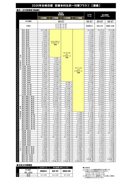 ●択一式対策講座【理論編】1民法第1回'258/1(金)Z'258/8(金)'258/5(火)'258/8(金)2民法第2回8/2(土)A8/9(土)8/6(水)8/9(土)3民法第3回8/2(土)B8/9(土)8/6(水)8/9(土)4民法第4回8/8(金)Z8/15(金)8/13(水)8/15(金)5民法第5回8/9(土)A8/16(土)8/14(木)8/16(土)6民法第6回8/9(土)B8/16(土)8/14(木)8/16(土)7民法第7回8/16(土)A8/23(土)8/20(水)8/23(土)8民法第8回8/16(土)B8/23(土)8/20(水)8/23(土)9民法第9回8/22(金)Z8/29(金)8/26(火)8/29(金)10民法第10回8/23(土)A8/30(土)8/27(水)8/30(土)11民法第11回8/23(土)B8/30(土)8/27(水)8/30(土)12民法第12回8/29(金)Z9/5(金)9/2(火)9/5(金)13民法第13回8/30(土)A9/6(土)9/3(水)9/6(土)14民法第14回8/30(土)B9/6(土)9/3(水)9/6(土)15民法第15回9/5(金)Z9/5(金)Z9/12(金)9/9(火)9/12(金)16民法第16回9/6(土)A9/6(土)A9/13(土)9/10(水)9/13(土)17民法第17回9/6(土)B9/6(土)B9/13(土)9/10(水)9/13(土)18民法第18回9/12(金)Z9/12(金)Z9/19(金)9/17(水)9/19(金)19不登法第1回9/13(土)A9/13(土)A9/20(土)9/18(木)9/20(土)20不登法第2回9/13(土)B9/13(土)B9/20(土)9/18(木)9/20(土)21不登法第3回9/19(金)Z9/19(金)Z9/26(金)9/24(水)9/26(金)22不登法第4回9/20(土)A9/20(土)A9/27(土)9/25(木)9/27(土)23不登法第5回9/20(土)B9/20(土)B9/27(土)9/25(木)9/27(土)24不登法第6回9/26(金)Z9/26(金)Z10/3(金)9/30(火)10/3(金)25不登法第7回9/27(土)A9/27(土)A10/4(土)10/1(水)10/4(土)26不登法第8回9/27(土)B9/27(土)B10/4(土)10/1(水)10/4(土)27不登法第9回10/3(金)Z10/3(金)Z10/3(金)Z10/10(金)10/7(火)10/10(金)28不登法第10回10/4(土)A10/4(土)A10/4(土)A10/11(土)10/8(水)10/11(土)29不登法第11回10/4(土)B10/4(土)B10/4(土)B10/11(土)10/8(水)10/11(土)30不登法第12回10/10(金)Z10/10(金)Z10/10(金)Z10/17(金)10/15(水)10/17(金)31不登法第13回10/11(土)A10/11(土)A10/11(土)A10/18(土)10/16(木)10/18(土)32不登法第14回10/11(土)B10/11(土)B10/11(土)B10/18(土)10/16(木)10/18(土)33不登法第15回10/17(金)Z10/17(金)Z10/17(金)Z10/24(金)10/21(火)10/24(金)34商法・商登法第1回10/18(土)A10/18(土)A10/18(土)A10/25(土)10/22(水)10/25(土)35商法・商登法第2回10/18(土)B10/18(土)B10/18(土)B10/25(土)10/22(水)10/25(土)36商法・商登法第3回10/24(金)Z10/24(金)Z10/24(金)Z10/31(金)10/28(火)10/31(金)37商法・商登法第4回10/25(土)A10/25(土)A10/25(土)A11/1(土)10/29(水)11/1(土)38商法・商登法第5回10/25(土)B10/25(土)B10/25(土)B11/1(土)10/29(水)11/1(土)39商法・商登法第6回10/31(金)Z10/31(金)Z10/31(金)Z11/7(金)11/5(水)11/7(金)40商法・商登法第7回11/1(土)A11/1(土)A11/1(土)A11/8(土)11/6(木)11/8(土)41商法・商登法第8回11/1(土)B11/1(土)B11/1(土)B11/8(土)11/6(木)11/8(土)42商法・商登法第9回11/7(金)Z11/7(金)Z11/7(金)Z11/7(金)Z11/14(金)11/11(火)11/14(金)43商法・商登法第10回11/14(金)Z11/14(金)Z11/14(金)Z11/14(金)Z11/21(金)11/18(火)11/21(金)44商法・商登法第11回11/21(金)Z11/21(金)Z11/21(金)Z11/21(金)Z11/28(金)11/26(水)11/28(金)45商法・商登法第12回11/28(金)Z11/28(金)Z11/28(金)Z11/28(金)Z12/5(金)12/2(火)12/5(金)46商法・商登法第13回12/4(木)Z12/4(木)Z12/4(木)Z12/4(木)Z12/11(木)12/8(月)12/11(木)47商法・商登法第14回12/5(金)Z12/5(金)Z12/5(金)Z12/5(金)Z12/12(金)12/9(火)12/12(金)48商法・商登法第15回12/11(木)Z12/11(木)Z12/11(木)Z12/11(木)Z12/18(木)12/15(月)12/18(木)49商法・商登法第16回12/12(金)Z12/12(金)Z12/12(金)Z12/12(金)Z12/19(金)12/16(火)12/19(金)50商法・商登法第17回12/18(木)Z12/18(木)Z12/18(木)Z12/18(木)Z12/24(水)12/22(月)12/24(水)51民訴等第1回12/19(金)Z12/19(金)Z12/19(金)Z12/19(金)Z12/25(木)12/23(火)12/25(木)52民訴等第2回12/25(木)Z12/25(木)Z12/25(木)Z12/25(木)Z'261/7(水)'261/6(火)'261/7(水)53民訴等第3回12/26(金)Z12/26(金)Z12/26(金)Z12/26(金)Z1/8(木)1/7(水)1/8(木)54民訴等第4回'261/8(木)Z'261/8(木)Z'261/8(木)Z'261/8(木)Z1/14(水)1/13(火)1/14(水)55民訴等第5回1/9(金)Z1/9(金)Z1/9(金)Z1/9(金)Z1/15(木)1/14(水)1/15(木)56民訴等第6回1/15(木)Z1/15(木)Z1/15(木)Z1/15(木)Z1/22(木)1/19(月)1/22(木)57民訴等第7回1/16(金)Z1/16(金)Z1/16(金)Z1/16(金)Z1/23(金)1/20(火)1/23(金)58民訴等第8回1/23(金)Z1/23(金)Z1/23(金)Z1/23(金)Z1/30(金)1/27(火)1/30(金)59供託・書士法第1回1/30(金)Z1/30(金)Z1/30(金)Z1/30(金)Z2/6(金)2/3(火)2/6(金)60供託・書士法第2回2/6(金)Z2/6(金)Z2/6(金)Z2/6(金)Z2/13(金)2/10(火)2/13(金)61供託・書士法第3回2/13(金)Z2/13(金)Z2/13(金)Z2/13(金)Z2/20(金)2/17(火)2/20(金)62供託・書士法第4回2/20(金)Z2/20(金)Z2/20(金)Z2/20(金)Z2/27(金)2/25(水)2/27(金)63憲法・刑法第1回2/27(金)Z2/27(金)Z2/27(金)Z2/27(金)Z3/6(金)3/3(火)3/6(金)64憲法・刑法第2回3/6(金)Z3/6(金)Z3/6(金)Z3/6(金)Z3/13(金)3/10(火)3/13(金)65憲法・刑法第3回3/13(金)Z3/13(金)Z3/13(金)Z3/13(金)Z3/20(金・祝)3/17(火)3/20(金・祝)66憲法・刑法第4回3/20(金・祝)Z3/20(金・祝)Z3/20(金・祝)Z3/20(金・祝)Z3/27(金)3/24(火)3/27(金)●法改正対策講座●注意事項※12※'262/9(月)'262/9(月)第2回第1回日程・カリキュラム・講師等は、やむを得ない事情に③15:30~18:30④18:30~21:30(日曜日の④の時間帯はございません)。ビデオブースの視聴時間帯は次の通りです①9:30~12:30②12:30~15:30より変更されることがございます。ビデオブースWeb配信(音声DLフォロー含む)担当講師:視聴開始日動画・音声講義録(板書)髙田たかだ有ゆ里香りか'262/9(月)民法・不動産登記法'259/1(月)よりビデオブース受講'2510/1(水)よりビデオブース受講'2511/1(土)よりビデオブース受講商法・商業登記法マイナー科目担当講師姫野ひめの寛之ひろゆき姫野ひめの寛之ひろゆき姫野ひめの寛之ひろゆき姫野ひめの寛之ひ