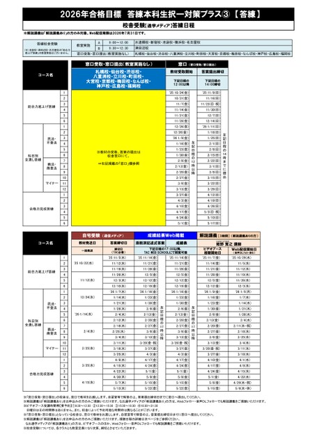窓口受取・窓口提出(教室実施なし)札幌校・仙台校・渋谷校・八重洲校・立川校・町田校・大宮校・京都校・梅田校・なんば校・神戸校・広島校・福岡校窓口受取・窓口提出(教室実施なし)窓口(窓口受取/窓口提出)教材受取開始答案提出締切下記日程の12:00以降下記日程の14:00締切'2510/24(金)'2511/9(日)左記日程の14時までに提出11/16(日)11/23(日・祝)11/30(日)12/7(日)12/14(日)'261/11(日)1/18(日)1/25(日)2/1(日)2/8(日)2/15(日)2/22(日)3/1(日)3/8(日)3/15(日)3/22(日)3/29(日)4/12(日)4/19(日)4/26(日)5/3(日・祝)5/10(日)5/17(日)左記日程の12時以降10/31(金)11/7(金)11/14(金)11/21(金)11/28(金)12/26(金)12/26(金)'261/9(金)1/16(金)1/23(金)1/30(金)2/6(金)2/13(金)2/20(金)2/27(金)3/6(金)3/13(金)3/27(金)4/3(金)4/10(金)4/17(金)4/24(金)5/1(金)札幌校・仙台校・渋谷校・八重洲校・立川校・町田校・大宮校・京都校・梅田校・なんば校・神戸校・広島校・福岡校※教材の受取、答案の提出は校舎窓口にて。⇒右記掲載の「窓口」欄参照自宅受験(通信メディア)成績結果Web掲載解説講義[3時間](解説講義ありの方)教材発送日答案締切日添削済記述式答案成績表ひめのひろゆき姫野寛之講師一括発送締切日(TAC必着)下記日程の17:00以降、TACWEBSCHOOLにて閲覧可能ビデオブース視聴開始日Web配信開始日(音声DLフォロー含む)'2511/5(水)'2511/14(金)'2511/14(金)'2511/7(金)'2510/29(水)11/12(水)11/19(水)11/26(水)12/3(水)12/10(水)11/21(金)11/28(金)12/5(金)12/12(金)12/19(金)11/21(金)11/28(金)12/5(金)12/12(金)12/19(金)11/14(金)11/21(金)11/28(金)12/5(金)12/12(金)11/5(水)11/12(水)11/19(水)11/26(水)12/3(水)'261/7(水)'261/16(金)'261/16(金)'261/9(金)'261/5(月)1/7(水)1/14(水)1/21(水)1/28(水)2/4(水)2/11(水・祝)2/18(水)2/25(水)3/4(水)3/11(水)3/18(水)4/1(水)4/8(水)4/15(水)4/22(水)4/29(水・祝)5/6(水・休)1/16(金)1/23(金)1/30(金)2/6(金)2/13(金)2/20(金)2/27(金)3/6(金)3/13(金)3/20(金・祝)3/27(金)4/10(金)4/17(金)4/24(金)5/1(金)5/8(金)5/15(金)左記日程の17時以降1/23(金)1/30(金)2/6(金)2/13(金)2/20(金)2/27(金)3/6(金)3/13(金)左記日程の17時以降1/23(金)1/30(金)2/6(金)2/13(金)2/20(金)2/27(金)3/6(金)3/13(金)3/20(金・祝)3/20(金・祝)3/27(金)4/3(金)4/17(金)4/24(金)5/1(金)5/8(金)5/15(金)5/22(金)3/27(金)4/3(金)4/17(金)4/24(金)5/1(金)5/8(金)5/15(金)5/22(金)1/14(水)1/21(水)1/28(水)2/4(水)2/12(木)2/18(水)2/25(水)3/4(水)3/11(水)3/18(水)3/25(水)4/8(水)4/15(水)4/22(水)4/30(木)5/7(木)5/13(水)'2510/22(水)11/12(水)12/24(水)'261/14(水)2/4(水)2/25(水)3/25(水)4/15(水)(※)池袋校・津田沼校・名古屋校の「総合力底上げ答練」の教室実施はございません。コース名総合力底上げ答練科目別全潰し答練民法・不登法商法・商登法マイナー合格力完成答練コース名総合力底上げ答練科目別全潰し答練民法・不登法商法・商登法マイナー合格力完成答練123456123456789101112123456123456123456789101112123456答練校舎受験教室実施AB9:00~12:00水道橋校・新宿校・池袋校・横浜校・名古屋校9:30~12:30津田沼校2026年合格目標答練本科生択一対策プラス③【答練】※解説講義は「解説講義あり」の方のみ対象。Web配信期限は2026年7月31日です。校舎受験【通学メディア】答練日程※「窓口受取・窓口提出」の校舎は、窓口で教材をお渡しします。自習室等で解答の上、答案提出締切日までに窓口へ提出してください。※解説講義は「解説講義あり」をお申込みの方のみご視聴いただけます。なお通学メディアの「解説講義あり」の方は、Webフォロー・音声DLフォローでも解説講義をご視聴いただけます。※ビデオブース受講時間帯【要予約】①9:30~12:30②12:30~15:30③15:30~18:30④18:30~21:30日曜日は④の時間帯はありません。また、校舎によって予約可能な時間枠は異なることがございます。※「窓口受取・窓口提出」となっている校舎は、窓口で教材をお渡しします。自習室等で解答の上、答案提出締切日までに窓口へ提出してください。※解説講義は「解説講義あり」をお申込みの方のみご視聴いただけます。視聴日程の詳細は次ページをご参照ください。なお通学メディアの「解説講義あり」の方は、ビデオブースのほか、Webフォロー・音声DLフォローでも解説講義をご視聴いただけます。※校舎受験については、各クラスとも教室定員になり次第、締切とさせていただきます。