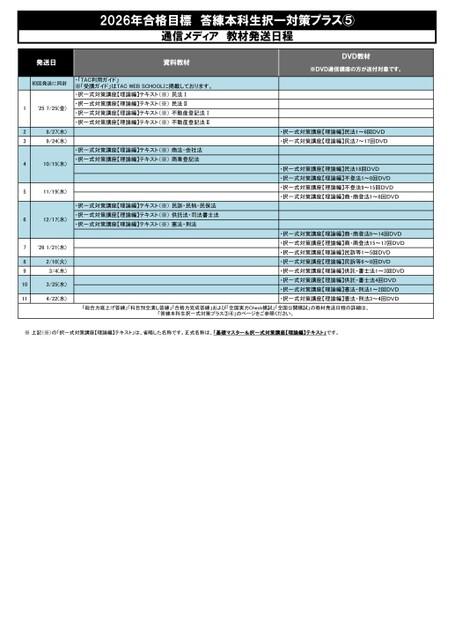2026年合格目標答練本科生択一対策プラス⑤通信メディア教材発送日程発送日資料教材初回発送に同封・「TAC利用ガイド」※「受講ガイド」はTACWEBSCHOOLに掲載しております。DVD教材※DVD通信講座の方が送付対象です。・択一式対策講座【理論編】テキスト(※)民法Ⅰ・択一式対策講座【理論編】テキスト(※)民法Ⅱ・択一式対策講座【理論編】テキスト(※)不動産登記法Ⅰ・択一式対策講座【理論編】テキスト(※)不動産登記法Ⅱ・択一式対策講座【理論編】テキスト(※)商法・会社法・択一式対策講座【理論編】テキスト(※)商業登記法・択一式対策講座【理論編】テキスト(※)民訴・民執・民保法・択一式対策講座【理論編】テキスト(※)供託法・司法書士法・択一式対策講座【理論編】テキスト(※)憲法・刑法1234567891011'257/25(金)8/27(水)9/24(水)10/15(水)11/19(水)12/17(水)'261/21(水)2/10(火)3/4(水)3/25(水)4/22(水)・択一式対策講座【理論編】民法1~6回DVD・択一式対策講座【理論編】民法7~17回DVD・択一式対策講座【理論編】民法18回DVD・択一式対策講座【理論編】不登法1~8回DVD・択一式対策講座【理論編】不登法9~15回DVD・択一式対策講座【理論編】商・商登法1~8回DVD・択一式対策講座【理論編】商・商登法9~14回DVD・択一式対策講座【理論編】商・商登法15~17回DVD・択一式対策講座【理論編】民訴等1~5回DVD・択一式対策講座【理論編】民訴等6~8回DVD・択一式対策講座【理論編】供託・書士法1~3回DVD・択一式対策講座【理論編】供託・書士法4回DVD・択一式対策講座【理論編】憲法・刑法1~2回DVD・択一式対策講座【理論編】憲法・刑法3~4回DVD「総合力底上げ答練」「科目別全潰し答練」「合格力完成答練」および「全国実力Check模試」「全国公開模試」の教材発送日程の詳細は、「答練本科生択一式対策プラス③④」のページをご参照ください。※上記(※)の「択一式対策講座【理論編】テキスト」は、省略した名称です。正式名称は、「基礎マスター&択一式対策講座【理論編】テキスト」です。