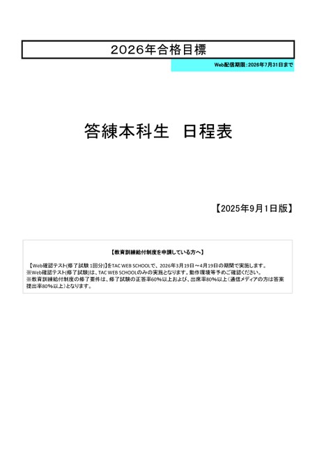 2026年合格目標Web配信期限:2026年7月31日まで答練本科生日程表【2025年9月1日版】【教育訓練給付制度を申請している方へ】【Web確認テスト(修了試験1回分)】をTACWEBSCHOOLで、2026年3月19日~4月19日の期間で実施します。※Web確認テスト(修了試験)は、TACWEBSCHOOLのみの実施となります。動作環境等予めご確認ください。※教育訓練給付制度の修了要件は、修了試験の正答率60%以上および、出席率80%以上(通信メディアの方は答案提出率80%以上)となります。