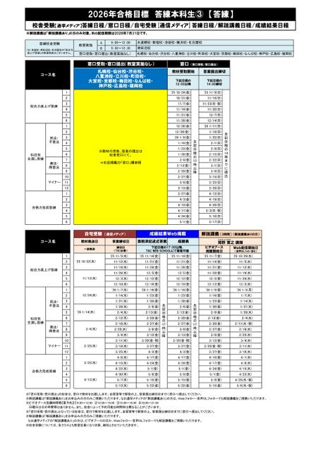 2026年合格目標答練本科生③【答練】校舎受験【通学メディア】答練日程/窓口日程/自宅受験[通信メディア]答練日程/解説講義日程/成績結果日程※解説講義は「解説講義あり」の方のみ対象。Web配信期限は2026年7月31日です。答練校舎受験(※)池袋校・津田沼校・名古屋校の「総合力底上げ答練」の教室実施はございません。教室実施AB9:00~12:00水道橋校・新宿校・池袋校・横浜校・名古屋校9:30~12:30津田沼校窓口受取・窓口提出(教室実施なし)札幌校・仙台校・渋谷校・八重洲校・立川校・町田校・大宮校・京都校・梅田校・なんば校・神戸校・広島校・福岡校窓口受取・窓口提出(教室実施なし)窓口(窓口受取/窓口提出)教材受取開始答案提出締切下記日程の12:00以降下記日程の14:00締切'2510/24(金)'2511/9(日)左記日程の14時までに提出11/16(日)11/23(日・祝)11/30(日)12/7(日)12/14(日)'261/11(日)1/18(日)1/25(日)2/1(日)2/8(日)2/15(日)2/22(日)3/1(日)3/8(日)3/15(日)3/22(日)3/29(日)4/12(日)4/19(日)4/26(日)5/3(日・祝)5/10(日)5/17(日)左記日程の12時以降10/31(金)11/7(金)11/14(金)11/21(金)11/28(金)12/26(金)12/26(金)'261/9(金)1/16(金)1/23(金)1/30(金)2/6(金)2/13(金)2/20(金)2/27(金)3/6(金)3/13(金)3/27(金)4/3(金)4/10(金)4/17(金)4/24(金)5/1(金)札幌校・仙台校・渋谷校・八重洲校・立川校・町田校・大宮校・京都校・梅田校・なんば校・神戸校・広島校・福岡校※教材の受取、答案の提出は校舎窓口にて。⇒右記掲載の「窓口」欄参照自宅受験(通信メディア)成績結果Web掲載解説講義[3時間](解説講義ありの方)教材発送日答案締切日添削済記述式答案成績表ひめのひろゆき姫野寛之講師一括発送締切日(TAC必着)下記日程の17:00以降、TACWEBSCHOOLにて閲覧可能ビデオブース視聴開始日Web配信開始日(音声DLフォロー含む)'2511/5(水)'2511/14(金)'2511/14(金)'2511/7(金)'2510/29(水)11/12(水)11/19(水)11/26(水)12/3(水)12/10(水)11/21(金)11/28(金)12/5(金)12/12(金)12/19(金)11/21(金)11/28(金)12/5(金)12/12(金)12/19(金)11/14(金)11/21(金)11/28(金)12/5(金)12/12(金)11/5(水)11/12(水)11/19(水)11/26(水)12/3(水)'261/7(水)'261/16(金)'261/16(金)'261/9(金)'261/5(月)1/7(水)1/14(水)1/21(水)1/28(水)2/4(水)2/11(水・祝)2/18(水)2/25(水)3/4(水)3/11(水)3/18(水)4/1(水)4/8(水)4/15(水)4/22(水)4/29(水・祝)5/6(水・祝)1/16(金)1/23(金)1/30(金)2/6(金)2/13(金)2/20(金)2/27(金)3/6(金)3/13(金)3/20(金・祝)3/27(金)4/10(金)4/17(金)4/24(金)5/1(金)5/8(金)5/15(金)左記日程の17時以降1/23(金)1/30(金)2/6(金)2/13(金)2/20(金)2/27(金)3/6(金)3/13(金)左記日程の17時以降1/23(金)1/30(金)2/6(金)2/13(金)2/20(金)2/27(金)3/6(金)3/13(金)3/20(金・祝)3/20(金・祝)3/27(金)4/3(金)4/17(金)4/24(金)5/1(金)5/8(金)5/15(金)5/22(金)3/27(金)4/3(金)4/17(金)4/24(金)5/1(金)5/8(金)5/15(金)5/22(金)1/14(水)1/21(水)1/28(水)2/4(水)2/12(木)2/18(水)2/25(水)3/4(水)3/11(水)3/18(水)3/25(水)4/8(水)4/15(水)4/22(水)4/30(木)5/7(木)5/13(水)'2510/22(水)11/12(水)12/24(水)'261/14(水)2/4(水)2/25(水)3/25(水)4/15(水)コース名総合力底上げ答練科目別全潰し答練民法・不登法商法・商登法マイナー合格力完成答練コース名総合力底上げ答練科目別全潰し答練民法・不登法商法・商登法マイナー合格力完成答練123456123456789101112123456123456123456789101112123456※「窓口受取・窓口提出」の校舎は、窓口で教材をお渡しします。自習室等で解答の上、答案提出締切日までに窓口へ提出してください。※解説講義は「解説講義あり」をお申込みの方のみご視聴いただけます。なお通学メディアの「解説講義あり」の方は、Webフォロー・音声DLフォローでも解説講義をご視聴いただけます。※ビデオブース受講時間帯【要予約】①9:30~12:30②12:30~15:30③15:30~18:30④18:30~21:30日曜日は④の時間帯はありません。また、校舎によって予約可能な時間枠は異なることがございます。※「窓口受取・窓口提出」となっている校舎は、窓口で教材をお渡しします。自習室等で解答の上、答案提出締切日までに窓口へ提出してください。※解説講義は「解説講義あり」をお申込みの方のみご視聴いただけます。なお通学メディアの「解説講義あり」の方は、ビデオブースのほか、Webフォロー・音声DLフォローでも解説講義をご視聴いただけます。※校舎受験については、各クラスとも教室定員になり次第、締切とさせていただきます。