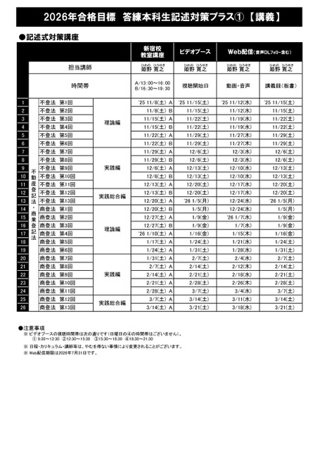 2026年合格目標答練本科生記述対策プラス①【講義】新宿校教室講座ひめの姫野ひろゆき寛之A/13:00~16:00B/16:30~19:30'2511/8(土)11/8(土)11/15(土)11/15(土)11/22(土)11/22(土)11/29(土)11/29(土)12/6(土)12/6(土)12/13(土)12/13(土)12/20(土)12/20(土)12/27(土)12/27(土)'261/10(土)1/17(土)1/24(土)1/31(土)2/7(土)2/14(土)2/21(土)2/28(土)3/7(土)3/14(土)ABABABABABABABABAAAAAAAAAAビデオブースWeb配信(音声DLフォロー含む)ひめの姫野ひろゆき寛之ひめの姫野ひろゆき寛之ひめの姫野ひろゆき寛之視聴開始日動画・音声講義録(板書)'2511/15(土)'2511/12(水)'2511/15(土)11/15(土)11/22(土)11/22(土)11/29(土)11/29(土)12/6(土)12/6(土)12/13(土)12/13(土)12/20(土)12/20(土)'261/5(月)1/5(月)1/9(金)1/9(金)1/16(金)1/24(土)1/31(土)2/7(土)2/14(土)2/21(土)2/28(土)3/7(土)3/14(土)3/21(土)11/12(水)11/19(水)11/19(水)11/27(木)11/27(木)12/3(水)12/3(水)12/10(水)12/10(水)12/17(水)12/17(水)12/24(水)12/24(水)'261/7(水)1/7(水)1/15(木)1/21(水)1/28(水)2/4(水)2/12(木)2/18(水)2/26(木)3/4(水)3/11(水)3/18(水)11/15(土)11/22(土)11/22(土)11/29(土)11/29(土)12/6(土)12/6(土)12/13(土)12/13(土)12/20(土)12/20(土)'261/5(月)1/5(月)1/9(金)1/9(金)1/16(金)1/24(土)1/31(土)2/7(土)2/14(土)2/21(土)2/28(土)3/7(土)3/14(土)3/21(土)理論編実践編実践総合編理論編実践編実践総合編●記述式対策講座担当講師時間帯不登法第1回不登法第2回不登法第3回不登法第4回不登法第5回不登法第6回不登法第7回不登法第8回不登法第9回不登法第10回不登法第11回不登法第12回不登法第13回商登法第1回商登法第2回商登法第3回商登法第4回商登法第5回商登法第6回商登法第7回商登法第8回商登法第9回商登法第10回商登法第11回商登法第12回商登法第13回不動産登記法・商業登記法1234567891011121314151617181920212223242526●注意事項※ビデオブースの視聴時間帯は次の通りです(日曜日の④の時間帯はございません)。①9:30~12:30②12:30~15:30③15:30~18:30④18:30~21:30※日程・カリキュラム・講師等は、やむを得ない事情により変更されることがございます。※Web配信期限は2026年7月31日です。