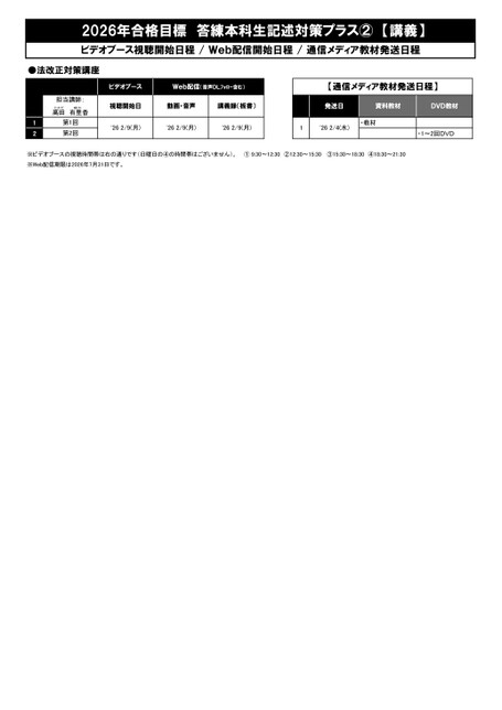 2026年合格目標答練本科生記述対策プラス②【講義】ビデオブース視聴開始日程/Web配信開始日程/通信メディア教材発送日程●法改正対策講座担当講師:たかだ髙田ゆりか有里香ビデオブースWeb配信(音声DLフォロー含む)【通信メディア教材発送日程】視聴開始日動画・音声講義録(板書)発送日資料教材DVD教材12第1回第2回'262/9(月)'262/9(月)'262/9(月)1'262/4(水)・教材・1~2回DVD※ビデオブースの視聴時間帯は右の通りです(日曜日の④の時間帯はございません)。①9:30~12:30②12:30~15:30③15:30~18:30④18:30~21:30※Web配信期限は2026年7月31日です。