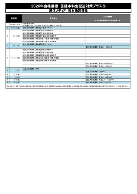 2026年合格目標答練本科生記述対策プラス⑥通信メディア教材発送日程発送日資料教材初回発送に同封・「TAC利用ガイド」※「受講ガイド」はTACWEBSCHOOLに掲載しております。1'2510/29(水)・記述式対策講座【理論編】不登法テキスト・記述式対策講座【実践編】不登法問題冊子・記述式対策講座【実践編】不登法答案用紙11/19(水)・記述式対策講座【実践編】不登法解答解説冊子・記述式対策講座【実践総合編】不登法問題・解答例・記述式対策講座【実践総合編】不登法答案用紙・記述式対策講座【理論編】商登法テキスト12/17(水)23・記述式対策講座【実践編】商登法問題冊子・記述式対策講座【実践編】商登法答案用紙・記述式対策講座【実践編】商登法解答解説冊子4'261/21(水)・記述式対策講座【実践総合編】商登法問題・解答例・記述式対策講座【実践総合編】商登法答案用紙・法改正対策講座教材567892/4(水)2/10(火)3/4(水)3/25(水)4/22(水)DVD教材※DVD通信講座の方が送付対象です。・記述式対策講座不登法1~8回DVD・記述式対策講座不登法9~13回DVD・記述式対策講座商登法1~3回DVD・法改正対策講座1~2回DVD・記述式対策講座商登法4~6回DVD・記述式対策講座商登法7~9回DVD・記述式対策講座商登法10~12回DVD・記述式対策講座商登法13回DVD「総合力底上げ答練」「科目別全潰し答練」「合格力完成答練」および「全国実力Check模試」「全国公開模試」の教材発送日程の詳細は、「答練本科生記述式対策プラス③④」のページをご参照ください。