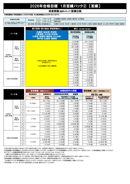 2026年合格目標1月答練パック②【答練】校舎受験【通学メディア】答練日程※解説講義は「解説講義あり」の方のみ対象。Web配信期限は2026年7月31日です。答練校舎受験教室実施(※)池袋校・津田沼校・名古屋校の「総合力底上げ答練」の教室実施はございません。AB9:00~12:00水道橋校・新宿校・池袋校・横浜校・名古屋校9:30~12:30津田沼校窓口受取・窓口提出(教室実施なし)札幌校・仙台校・渋谷校・八重洲校・立川校・町田校・大宮校・京都校・梅田校・なんば校・神戸校・広島校・福岡校窓口受取・窓口提出(教室実施なし)窓口(窓口受取/窓口提出)科目別全潰し答練民法・不登法商法・商登法マイナー合格力完成答練コース名科目別全潰し答練民法・不登法商法・商登法マイナー合格力完成答練123456789101112123456123456789101112123456自宅受験(通信メディア)成績結果Web掲載解説講義[3時間](解説講義ありの方)教材発送日答案締切日添削済記述式答案成績表ひめのひろゆき姫野寛之講師一括発送12/24(水)'261/14(水)2/4(水)2/25(水)3/25(水)4/15(水)締切日(TAC必着)下記日程の17:00以降、TACWEBSCHOOLにて閲覧可能'261/7(水)'261/16(金)'261/16(金)ビデオブース視聴開始日'261/9(金)Web配信開始日(音声DLフォロー含む)'261/5(月)1/14(水)1/21(水)1/28(水)2/4(水)2/11(水・祝)2/18(水)2/25(水)3/4(水)3/11(水)3/18(水)3/25(水)4/8(水)4/15(水)4/22(水)4/29(水・祝)5/6(水・祝)5/13(水)1/23(金)1/30(金)2/6(金)2/13(金)2/20(金)2/27(金)3/6(金)3/13(金)1/23(金)1/30(金)2/6(金)2/13(金)2/20(金)2/27(金)3/6(金)3/13(金)3/20(金・祝)3/20(金・祝)3/27(金)4/3(金)4/17(金)4/24(金)5/1(金)5/8(金)5/15(金)5/22(金)3/27(金)4/3(金)4/17(金)4/24(金)5/1(金)5/8(金)5/15(金)5/22(金)1/16(金)1/23(金)1/30(金)2/6(金)2/13(金)2/20(金)2/27(金)3/6(金)3/13(金)3/20(金・祝)3/27(金)4/10(金)4/17(金)4/24(金)5/1(金)5/8(金)5/15(金)1/7(水)1/14(水)1/21(水)1/28(水)2/4(水)2/11(水・祝)2/18(水)2/25(水)3/4(水)3/11(水)3/18(水)4/1(水)4/8(水)4/15(水)4/22(水)4/29(水・祝)5/6(水・祝)※「窓口受取・窓口提出」の校舎は、窓口で教材をお渡しします。自習室等で解答の上、答案提出締切日までに窓口へ提出してください。※解説講義は「解説講義あり」をお申込みの方のみご視聴いただけます。なお通学メディアの「解説講義あり」の方は、Webフォロー・音声DLフォローでも解説講義をご視聴いただけます。※ビデオブース受講時間帯【要予約】①9:30~12:30②12:30~15:30③15:30~18:30④18:30~21:30日曜日は④の時間帯はありません。また、校舎によって予約可能な時間枠は異なることがございます。※「窓口受取・窓口提出」となっている校舎は、窓口で教材をお渡しします。自習室等で解答の上、答案提出締切日までに窓口へ提出してください。※解説講義は「解説講義あり」をお申込みの方のみご視聴いただけます。視聴日程の詳細は次ページをご参照ください。なお通学メディアの「解説講義あり」の方は、ビデオブースのほか、Webフォロー・音声DLフォローでも解説講義をご視聴いただけます。※校舎受験については、各クラスとも教室定員になり次第、締切とさせていただきます。左記日程の14時までに提出下記日程の14:00締切'261/11(日)1/18(日)1/25(日)2/1(日)2/8(日)2/15(日)2/22(日)3/1(日)3/8(日)3/15(日)3/22(日)3/29(日)4/12(日)4/19(日)4/26(日)5/3(日・祝)5/10(日)5/17(日)左記日程の12時以降下記日程の12:00以降12/26(金)12/26(金)'261/9(金)1/16(金)1/23(金)1/30(金)2/6(金)2/13(金)2/20(金)2/27(金)3/6(金)3/13(金)3/27(金)4/3(金)4/10(金)4/17(金)4/24(金)5/1(金)教材受取開始答案提出締切コース名札幌校・仙台校・渋谷校・八重洲校・立川校・町田校・大宮校・京都校・梅田校・なんば校・神戸校・広島校・福岡校※教材の受取、答案の提出は校舎窓口にて。⇒右記掲載の「窓口」欄参照