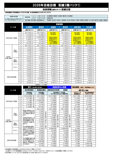 ※解説講義は「解説講義あり」の方のみ対象。Web配信期限は2026年7月31日です。AB1'2511/8(土)A'2511/9(日)A'2511/8(土)A211/15(土)A11/16(日)A11/15(土)A311/22(土)A11/23(日・祝)A11/22(土)A411/29(土)A11/30(日)A11/29(土)A512/6(土)A12/7(日)A12/6(土)A612/13(土)A12/14(日)A12/13(土)A1'261/10(土)A'261/11(日)A'261/10(土)A'261/10(土)A'261/11(日)B'261/10(土)A21/17(土)A1/18(日)A1/17(土)A1/17(土)A1/18(日)B1/17(土)A31/24(土)A1/25(日)A1/24(土)A1/24(土)A1/25(日)B1/24(土)A41/31(土)A2/1(日)A1/31(土)A1/31(土)A2/1(日)B1/31(土)A52/7(土)A2/8(日)A2/7(土)A2/7(土)A2/8(日)B2/7(土)A62/14(土)A2/15(日)A2/14(土)A2/14(土)A2/15(日)B2/14(土)A72/21(土)A2/22(日)A2/21(土)A2/21(土)A2/22(日)B2/21(土)A82/28(土)A3/1(日)A2/28(土)A2/28(土)A3/1(日)B2/28(土)A93/7(土)A3/8(日)A3/7(土)A3/7(土)A3/8(日)B3/7(土)A103/14(土)A3/15(日)A3/14(土)A3/14(土)A3/15(日)B3/14(土)A113/21(土)A3/22(日)A3/21(土)A3/21(土)A3/22(日)B3/21(土)A123/28(土)A3/29(日)A3/28(土)A3/28(土)A3/29(日)B3/28(土)A14/11(土)A4/12(日)A4/11(土)A4/11(土)A4/12(日)B4/11(土)A24/18(土)A4/19(日)A4/18(土)A4/18(土)A4/19(日)B4/18(土)A34/25(土)A4/26(日)A4/25(土)A4/25(土)A4/26(日)B4/25(土)A45/2(土)A5/3(日・祝)A5/2(土)A5/2(土)A5/3(日・祝)B5/2(土)A55/9(土)A5/10(日)A5/9(土)A5/9(土)A5/10(日)B5/9(土)A65/16(土)A5/16(土)A★5/16(土)A5/16(土)A5/17(日)B5/16(土)A★新宿校5/17(日)休館日1'2510/24(金)'2511/9(日)'2511/14(金)'2511/14(金)'2511/7(金)'2510/29(水)210/31(金)11/16(日)11/21(金)11/21(金)11/14(金)11/5(水)311/7(金)11/23(日・祝)11/28(金)11/28(金)11/21(金)11/12(水)411/14(金)11/30(日)12/5(金)12/5(金)11/28(金)11/19(水)511/21(金)12/7(日)12/12(金)12/12(金)12/5(金)11/26(水)611/28(金)12/14(日)12/19(金)12/19(金)12/12(金)12/3(水)1'261/11(日)'261/16(金)'261/16(金)'261/9(金)'261/5(月)21/18(日)1/23(金)1/23(金)1/16(金)1/7(水)31/25(日)1/30(金)1/30(金)1/23(金)1/14(水)42/1(日)2/6(金)2/6(金)1/30(金)1/21(水)52/8(日)2/13(金)2/13(金)2/6(金)1/28(水)62/15(日)2/20(金)2/20(金)2/13(金)2/4(水)72/22(日)2/27(金)2/27(金)2/20(金)2/11(水・祝)83/1(日)3/6(金)3/6(金)2/27(金)2/18(水)93/8(日)3/13(金)3/13(金)3/6(金)2/25(水)103/15(日)3/20(金・祝)3/20(金・祝)3/13(金)3/4(水)113/22(日)3/27(金)3/27(金)3/20(金・祝)3/11(水)123/29(日)4/3(金)4/3(金)3/27(金)3/18(水)14/12(日)4/17(金)4/17(金)4/10(金)4/1(水)24/19(日)4/24(金)4/24(金)4/17(金)4/8(水)34/26(日)5/1(金)5/1(金)4/24(金)4/15(水)45/3(日・祝)5/8(金)5/8(金)5/1(金)4/22(水)55/10(日)5/15(金)5/15(金)5/8(金)4/29(水・祝)65/17(日)5/22(金)5/22(金)5/15(金)5/6(水・祝)※解説講義は「解説講義あり」をお申込みの方のみご視聴いただけます。なお通学メディアの「解説講義あり」の方は、ビデオブースのほか、Webフォロー・音声DLフォローでも解説講義をご視聴いただけます。※校舎受験については、各クラスとも教室定員になり次第、締切とさせていただきます。名古屋校土曜午前クラス日曜午前クラス2026年合格目標答練3種パック①校舎受験【通学メディア】答練日程答練校舎受験(※)池袋校・津田沼校・名古屋校の「総合力底上げ答練」の教室実施はございません。教室実施9:00~12:00水道橋校・新宿校・池袋校・横浜校・名古屋校9:30~12:30津田沼校窓口受取・窓口提出(教室実施なし)札幌校・仙台校・渋谷校・八重洲校・立川校・町田校・大宮校・京都校・梅田校・なんば校・神戸校・広島校・福岡校コース名土曜午前クラス土曜午前クラス日曜午前クラス土曜午前クラス総合力底上げ答練窓口受取・窓口提出※教材の受取、⇒下記掲載の校舎窓口にて。答案の提出は「窓口」欄参照窓口受取・窓口提出※教材の受取、⇒下記掲載の校舎窓口にて。答案の提出は「窓口」欄参照窓口受取・窓口提出※教材の受取、⇒下記掲載の校舎窓口にて。答案の提出は「窓口」欄参照コース名教室受験水道橋校新宿校池袋校横浜校津田沼校科目別全潰し答練民法・不登法商法・商登法マイナー合格力完成答練窓口(窓口受取/窓口提出)成績結果Web掲載解説講義[3時間](解説講義ありの方)教材受取開始答案提出締切添削済記述式答案成績表姫野寛之ひめのひろゆき講師総合力底上げ答練左記日程の12時以降左記日程の14時までに提出左記日程の17時以降左記日程の17時以降12:00以降下記日程の14:00締切下記日程の下記日程の17:00以降、TACWEBSCHOOLにて閲覧可能視聴開始日ビデオブースWeb配信開始日(音声DLフォロー含む)科目別全潰し答練民法・不登法日に教室内で配付しの教材は、実施日当教室で受験される方ます。であれば、お渡し可頁の校舎窓口の教欠席回の教材は、次材受取開始日以降能です。案として成績判定をた場合と同じ正規答ば、教室で受験され日までに校舎窓口に右の答案提出締切提出していただけれ行います。績判定にお時間をいますが、通常より成右の期限を過ぎた場合も成績判定を行いただきます。商法・商登法マイナー合格力完成答練